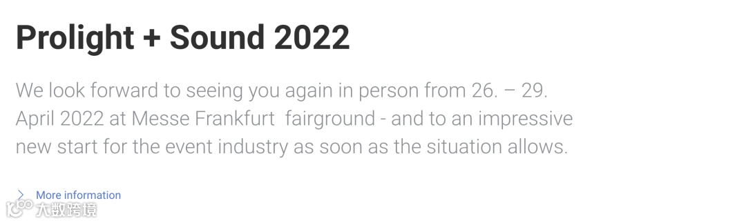 近日,法兰克福展览公司(Messe Frankfurt)宣布将取消原定于4月和5月的数个国际展览,其中包括原定于2021年4月13-16日举行的prolight + sound,计划将重点放到2022年4月26日至29日与大家再次见面。