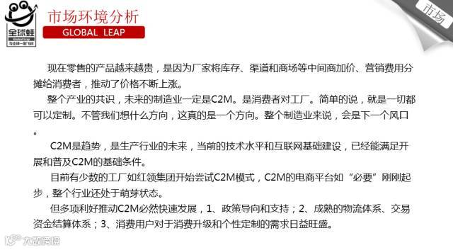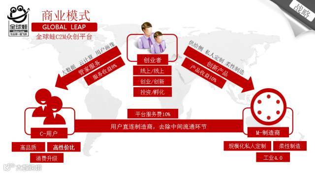 全球蛙将C2M商城与百万创客和制造商相结合,创新研发自有品牌商品,开发制造供给侧产品,解决制造业产能过剩现状,实现去库存,以量定产,按需生产,柔性制造,助力中国智造新飞跃,促进产业升级,推动中国工业4.0升级。
