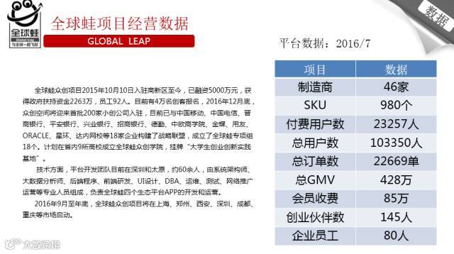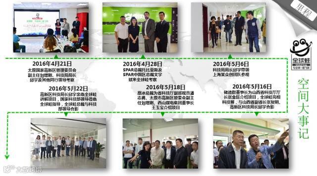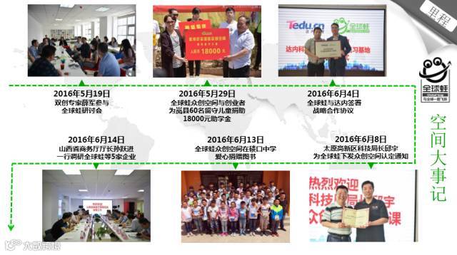2016年2月18日全球蛙众创平台和电商平台微信端上线;2016年4月18日完成天使融资,山西大昌集团投资2000万;山西阳光实业集团投资2000万;2016年6月1日在深圳南山区大冲商务中心成立全资子公司:深圳全球蛙网络科技供应链有限公司;深圳全球蛙教育科技网络有限公司;2016年6月8日全球蛙众创空间被认定为太原高新区众创空间;2016年7月3日,太原市财政局评审【并财审(II)(2016)46号】通过,给予全球蛙众创平台2263万元的财政无偿补贴。