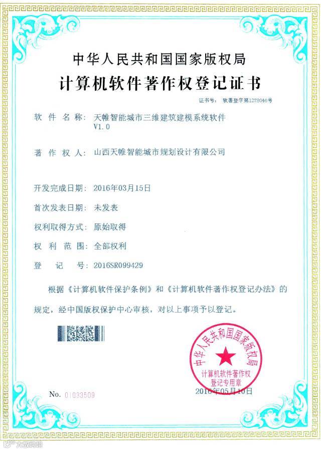 2016年软件著作权“天帷智能城市三维建筑建模系统软件”