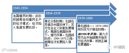 从二十世纪中期开始,越南先后经历了越法战争、越美战争、越柬战争等连年战乱,经济发展受到严重拖累。直到80年代,越南才稳定下来开始发展经济。1986年,越南实行体制改革,正式提出“革新开放”政策,从而打开对外招商引资的大门。