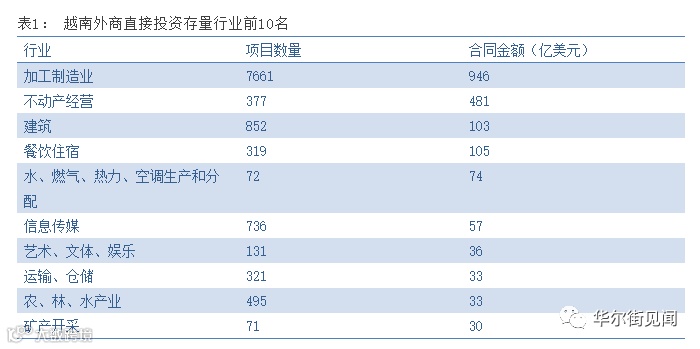 越南吸引外商投资最多的行业为制造业及加工业,占FDI流入总额的60%以上。其他投资领域还包括电力、燃气、热力及房地产行业(见表1)。在制造业中,FDI又多集中于加工贸易产业链的中低端,产品附加值较低。
