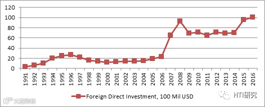 越南革新开放三十余年,FDI在经济发展中发挥了举足轻重的作用。一方面,FDI是越南社会总投资的重要来源,外资流入弥补了国内资金不足的短板。另一方面,FDI企业为越南创造了逾40%的工业总产值,且带来超过30亿美元的财政收入(2011年)。此外,FDI还创造了越南绝大部分的出口。在2016年越南对外出口总值中,FDI企业的贡献率高达56.6%。