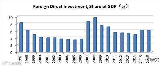 中国借助FDI流入,大力发展制造业,将“中国制造”成功推向世界。未来,越南能否复制中国道路,成功地推出“越南制造”呢?2016年,越南74%FDI流入了制造业,制造业对GDP增长贡献比约为12%。对比下,中国在1990年制造业对经济成长的贡献率已达到11.5%;2002年入世后,工业和出口飞速发展,工业增长对GDP贡献率一度超过60%。而工业中制造业占比约为50%,所以中国制造业在国民经济中占比已经接近30%左右。2008年后,由于中国大力发展服务业,以第二产业为代表的工业GDP占比才逐年下降,2014年时已下降至36%。可见,目前越南虽然绝大部分的FDI流入制造业,但总体对经济增长的贡献度还不高,接近于中国90年代初的水平。