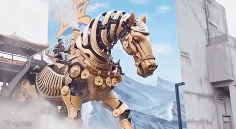 巨型机械战马仰首嘶鸣,栩栩如生,观众仿佛突然穿梭时空,进入了奇幻的异世界。