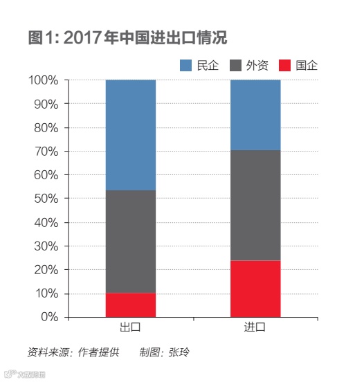 2017年,中国出口总额为22635亿美元,其中国企占10.2%、外资占43.2%、民企占46.6%,民营企业已经成为第一出口主力;进口总额为19410亿美元,其中国企占23.8%、外资占46.8%、民企占29.4%。民企已经成为中国外贸顺差和外汇储备的最大贡献者。