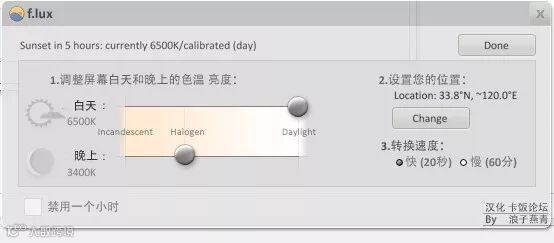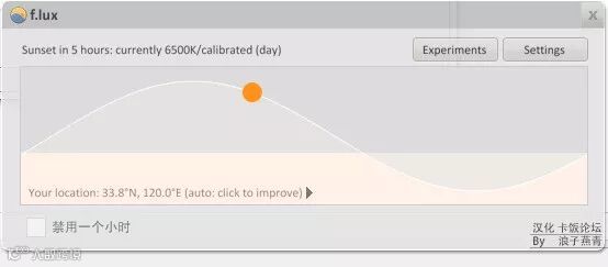 之后,就让 f.lux 自动运行吧,f.lux 会随着时间而改变色温,中午 12 点为色温最高点,夜里 12点为色温最低点。