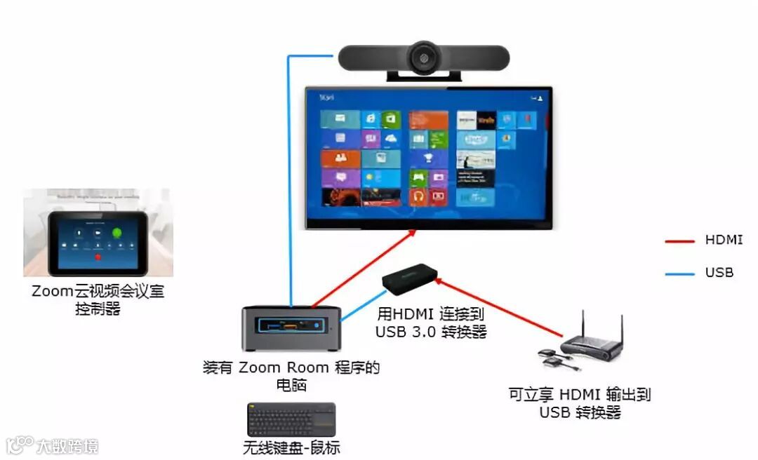 2. 用USB线将Zoom USB3.0转换器连接至装有Zoom应用程序电脑的USB端口。(如需使用反控功能,则还需用USB线缆将可立享主机及其中一台显示器进行连接)