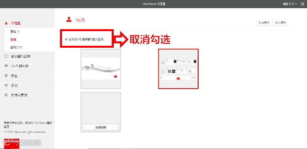 登录可立享设置器,在“个性化/墙纸”选项中,取消勾选“在无用户分享屏幕时显示壁纸。”