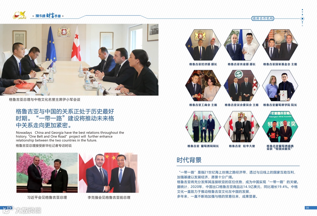 中格文化国际致力于推动一带一路经济发展,与中国政府相关部门及格鲁吉亚经济部,格鲁吉亚农业部,格鲁吉亚葡萄酒局,格鲁吉亚国家工商会,格鲁吉亚国家伙伴基金会、格鲁吉亚葡萄酒学院等政府机构及社会企事业单位建立了长期合作关系。