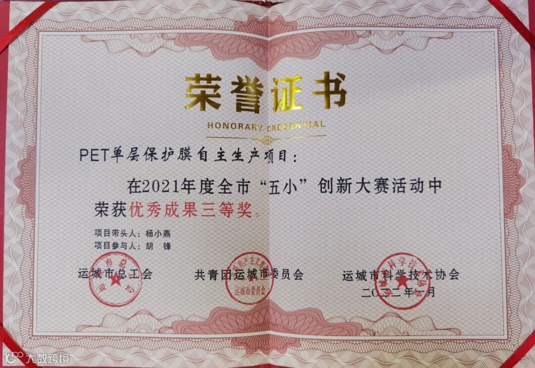 人人想创新,人人能创新。从2021年开始,胶贴车间全体人员打破固有生产思维模式,用时半年挑战自主生产PET保护膜,在没有增加任何固定资产的情况下,通过自主研制PET保护膜,稳定生产工艺,实现年节约成本26万元以上,取得良好经济效益。该项目获得运城市“五小”创新大赛优秀成果三等奖。