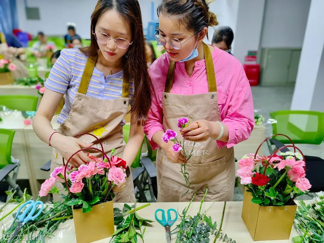 活动现场,花艺老师详细介绍了插花的技巧、色彩搭配及鲜花养护等知识,同时亲自指导示范选花、裁剪、造型等多方面插花技巧。