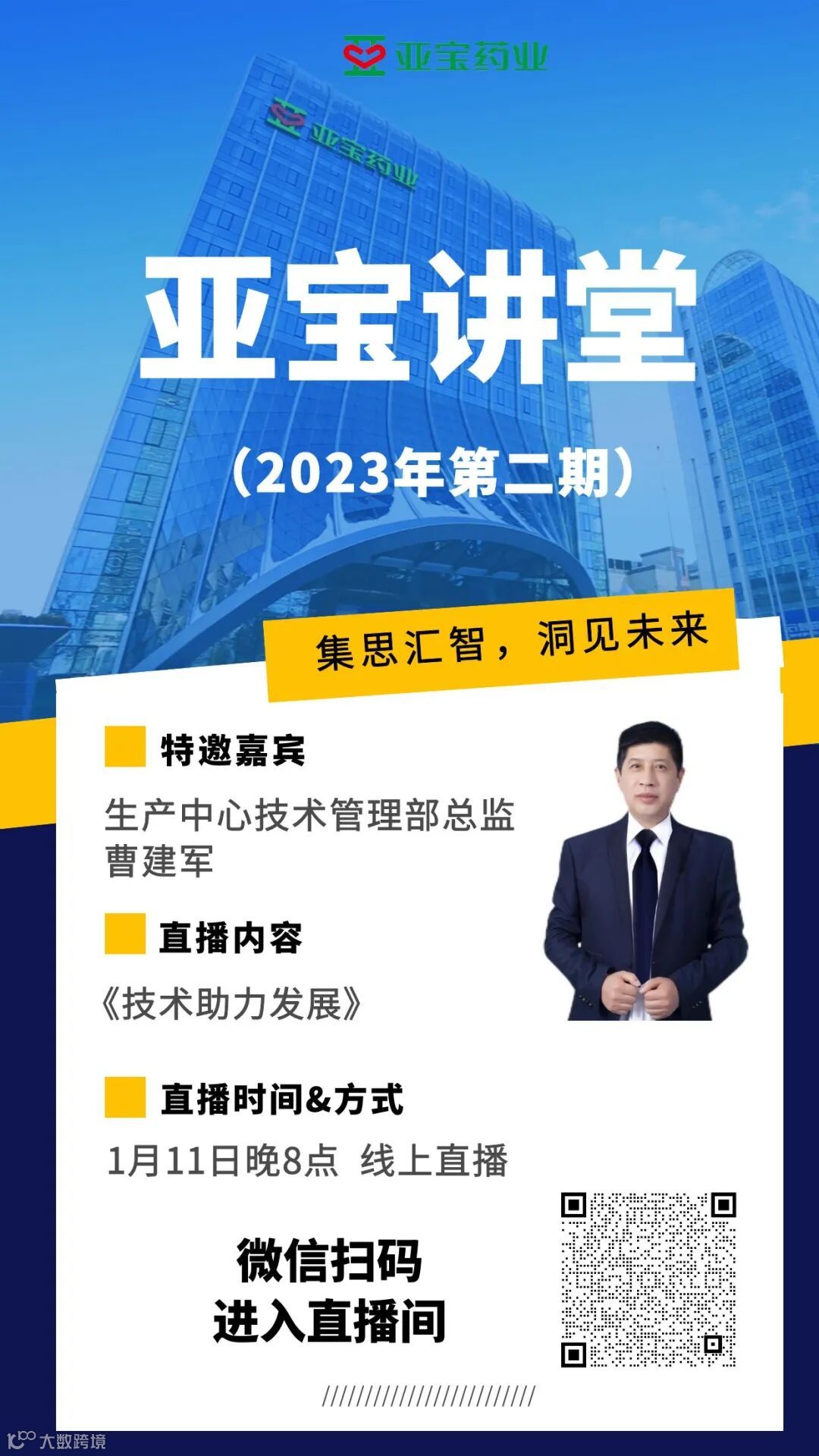 今晚8点,《亚宝讲堂》第二期特邀生产中心技术管理部总监曹建军先生作为主讲嘉宾,为大家带来一堂《技术助力发展》精彩课程。让我们一起聆听,共同进步!