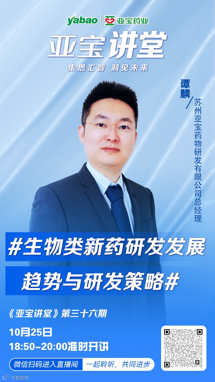 今晚7点,《亚宝讲堂》第三十六期特邀苏州亚宝药物研发有限公司总经理谭麟作为主讲嘉宾,为大家带来一堂《生物类新药研发发展趋势与研发策略》精彩课程。让我们一起聆听,共同进步!