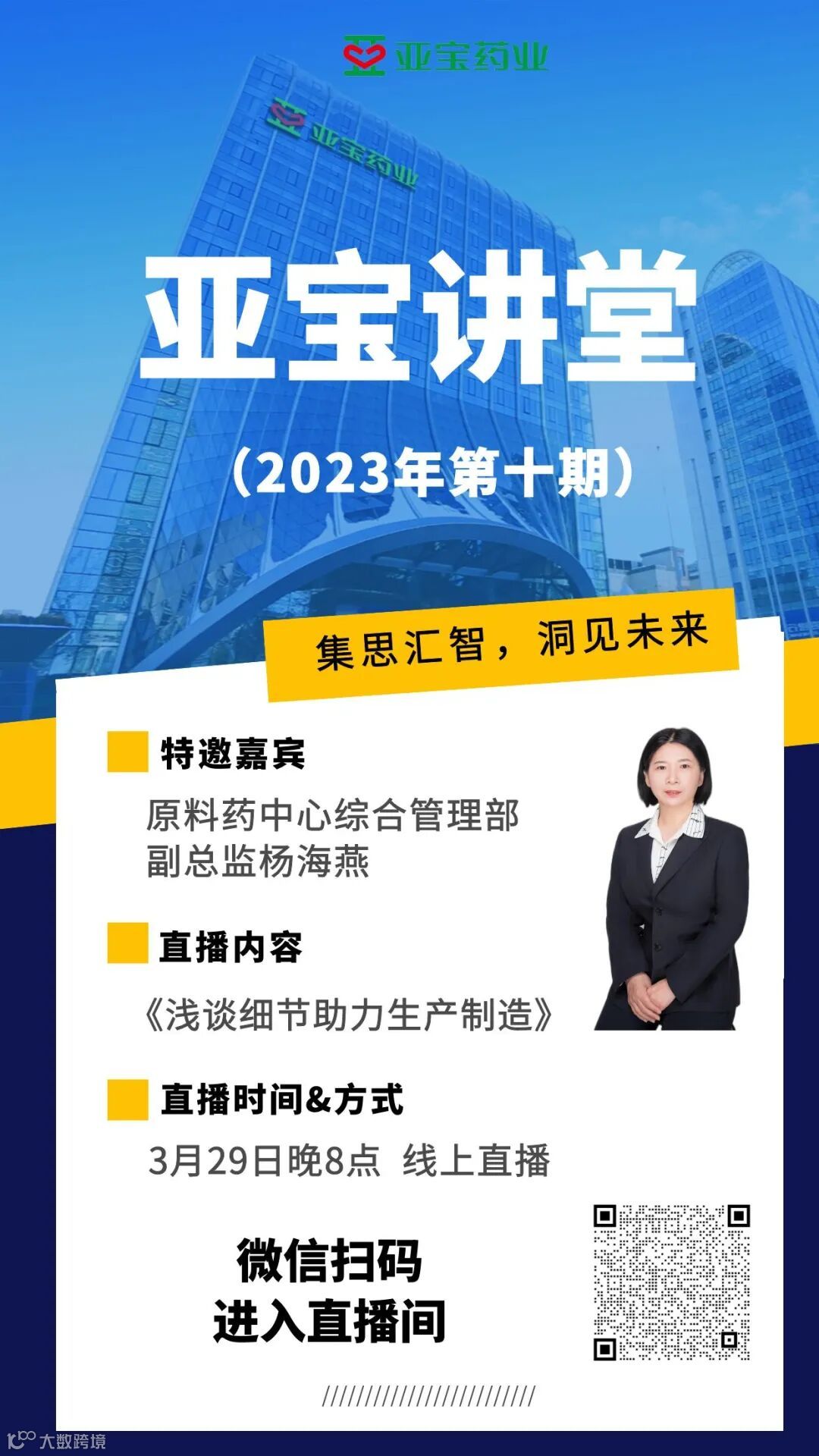今晚8点,《亚宝讲堂》第十期特邀原料药中心综合管理部副总监杨海燕作为主讲嘉宾,为大家带来一堂《浅谈细节助力生产制造》精彩课程。让我们一起聆听,共同进步!