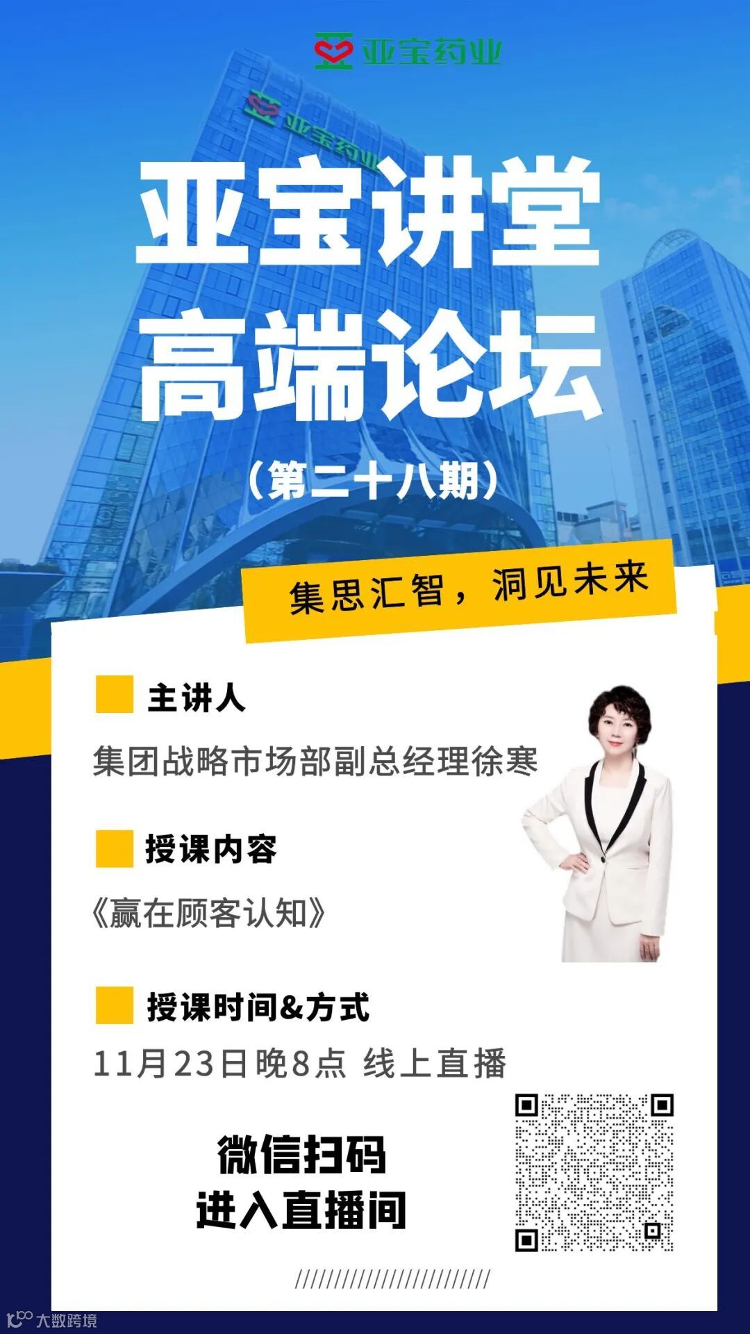 今晚8点,第二十八期“亚宝讲堂·高端论坛”特邀集团战略市场部副总经理徐寒作为主讲嘉宾,为大家带来一堂《赢在顾客认知》的精彩课程。让我们一起聆听,共同进步!