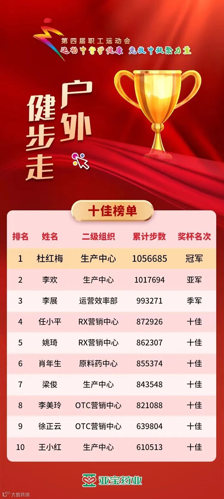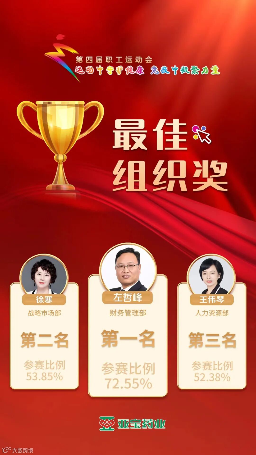 与此同时,本届运动会还推出了公司上市20周年“百年亚宝情,健康万里行”公益捐款活动。据统计,本次参与户外健步走项目的员工总步数累计达7489.4万步,集团公司为“亚宝一家人爱心基金会”捐款1万元,专门用于在职员工儿童疾病治疗等儿童健康事业。