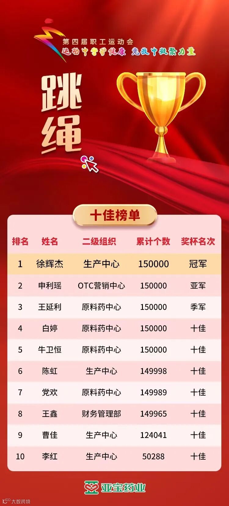 “云”端相聚,隔空竞技。10月1日-15日,亚宝集团第四届职工运动会为全体员工带来了一场既“入云端”,又“接地气”的线上运动会。此次运动会是为了庆祝亚宝药业上市20周年,全面践行“与健康携手,创生命绿洲”的企业使命,集团各职能部门、各中心员工共900人参赛。