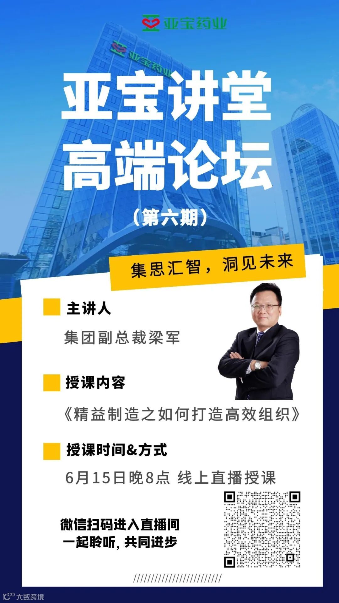今晚8点,第六期“亚宝讲堂·高端论坛”特邀集团副总裁梁军作为主讲嘉宾,为大家带来一堂《精益制造之如何打造高效组织》的精彩课程。让我们一起聆听,共同进步!