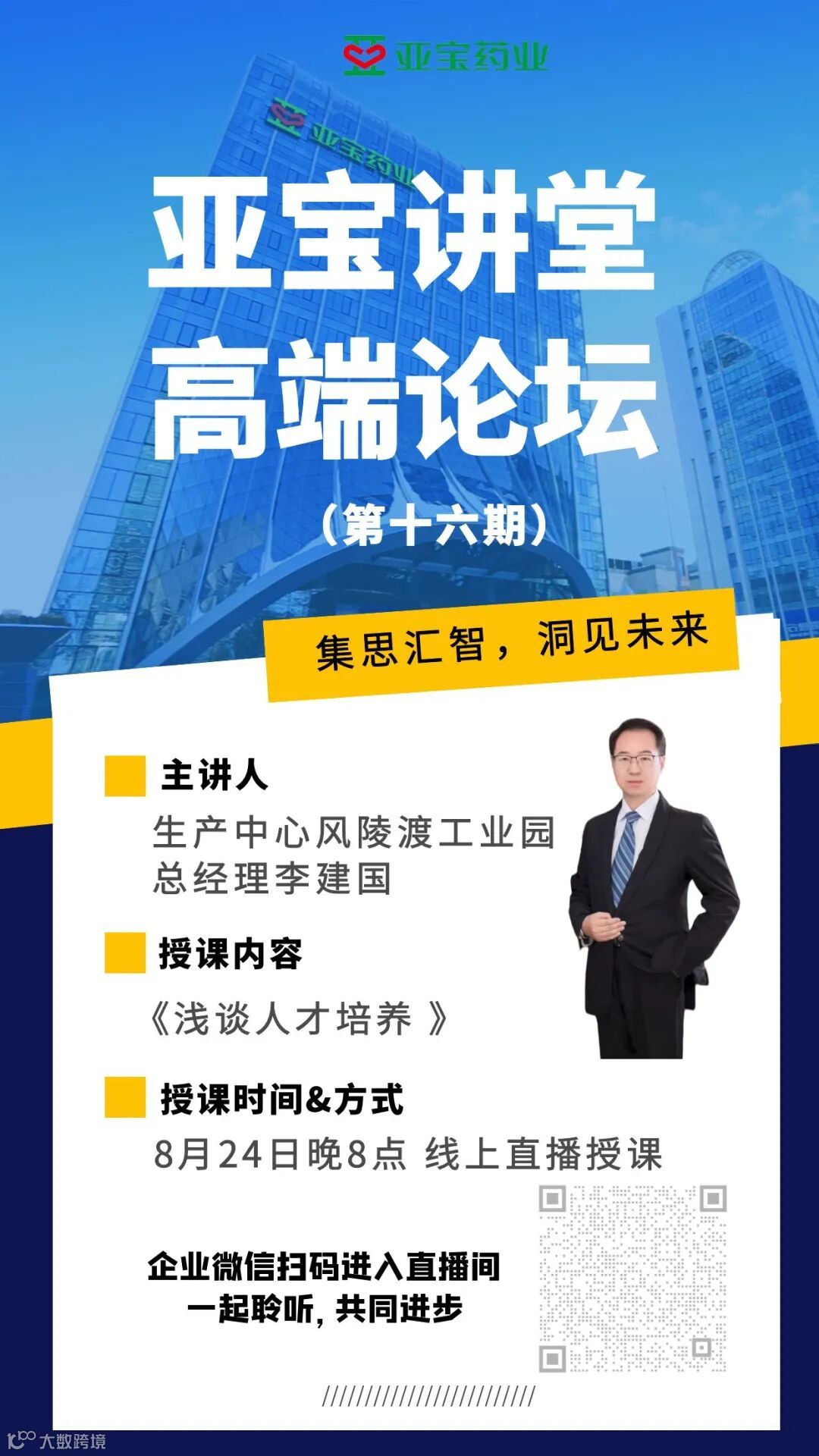 今晚8点,第十六期“亚宝讲堂·高端论坛”特邀生产中心风陵渡工业园总经理李建国作为主讲嘉宾,为大家带来一堂《浅谈人才培养》的精彩课程。让我们一起聆听,共同进步!