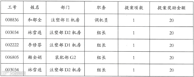 自11月27日至12月23日止,期间收集建议5项,经合理化建议评审小组评定为合理化建议5项,为感谢和鼓励各位同事的积参与,特给子此次5项合理化建议提人员提奖。