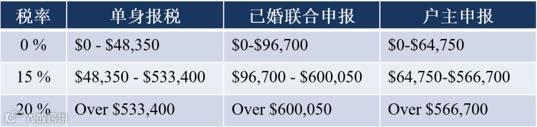 2025年, 对于单身申报者,收入在48,350美元以下可以适用0%的资本利得税率,这一档在2024年的标准是47,025美元;收入在48,350美元到533,400美元这个档位的单身申报者,长期投资需缴纳15%的资本利得税。