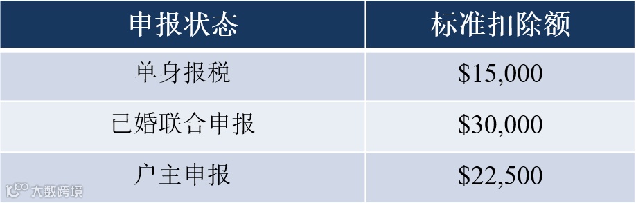 2025年单身标准扣除额将增加至$15,000,较2024年增加$400; 已婚联合申报的标准扣除额将达到$30,000,较2024年增加$800;户主的标准扣除额将增加至$22,500,较2024年增加$600。