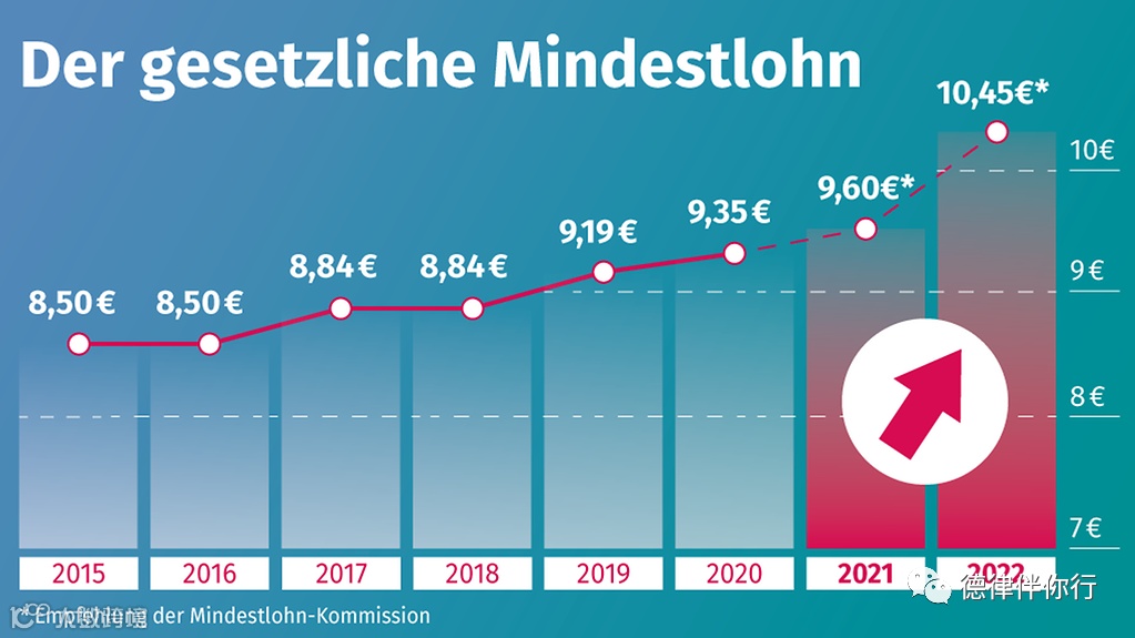 按照新联邦政府的施政纲要,计划将最低工资提高到12欧元/小时。在2022年1月1日逐步上调至9.82欧元/小时,并在2022年7月1日上调至10.45欧元/小时。目前最低工资为每小时9.60欧元/小时。