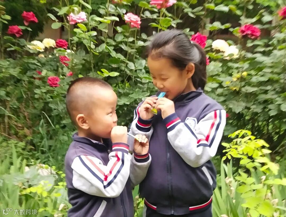 糖糖、迪迪姐弟俩在花园里边玩耍边吃丁桂薏芽健脾凝胶