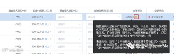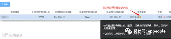 1:企业可以将鼠标放置在黄色问号处,查看新老名录的危险废物差异信息。如下图所示。