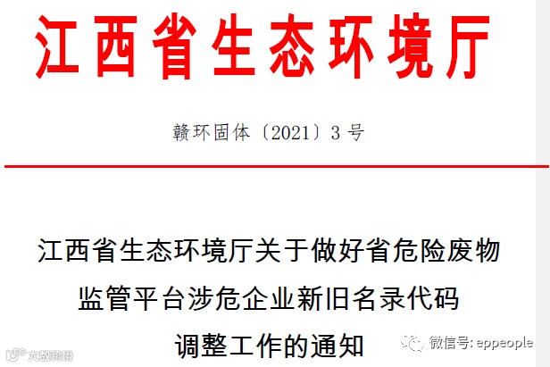 赣环固体〔2021〕3号 江西省生态环境厅关于做好省危险废物监管平台涉危企业新旧名录代码调整工作的通知(点击左侧链接查看下载全文)