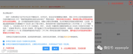 人工变更项全部完成后,点击右上角关闭按钮,仔细阅读并勾选信息后,点击确定按钮,完成危险废物名录变更,如下图所示。