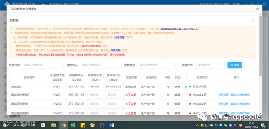 注:系统自动修订的危废名录信息,企业仅需查看内容变动,无需其他操作,待步骤三名录确认变更完成后,系统会自动完成新老名录变更。