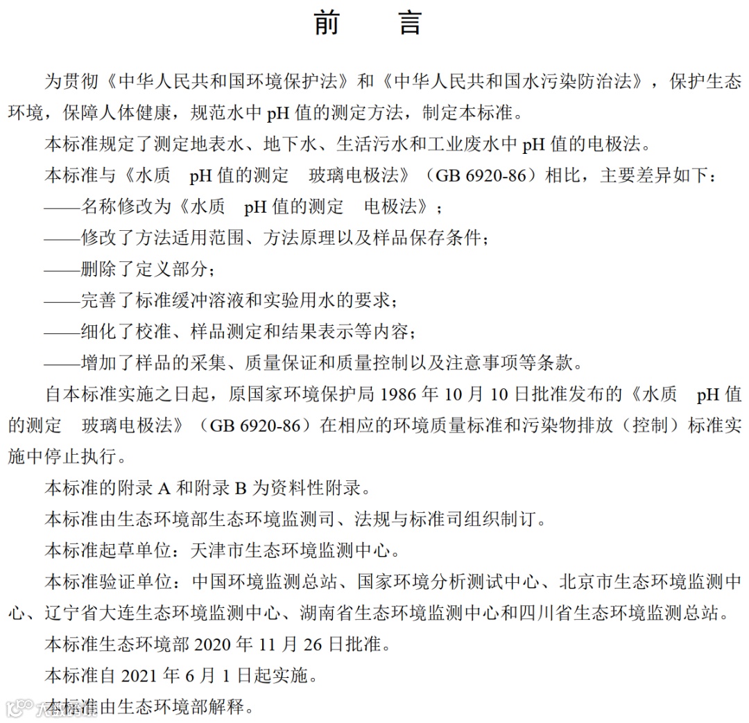 为贯彻《中华人民共和国环境保护法》,保护生态环境,保障人体健康,规范生态环境监测工作,现批准《水质 pH值的测定 电极法》为国家环境保护标准,并予发布。
