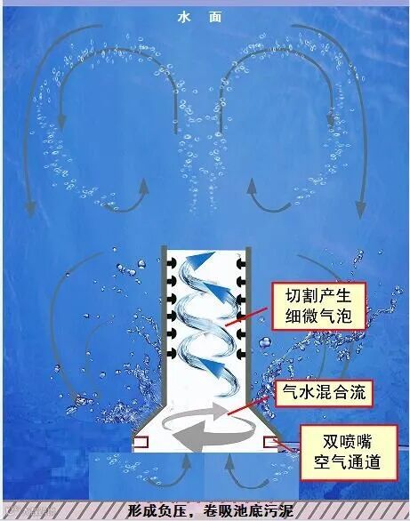 旋流曝气器,原理是气流高速喷射,在筒体内与污水混合后被蘑菇头切割,形成微小气泡,同时形成负压卷吸池底污泥。旋流是最近几年兴起的一种新型曝气工艺,6米清水氧利用率大约18%-25%。因为可以不停产安装,不易堵塞,寿命达十年以上,能耗适中,近年在工业废水领域已开始大面积应用。