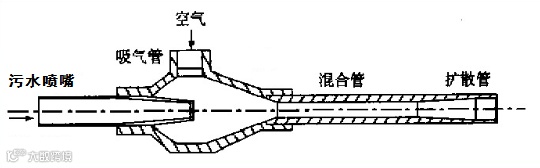 射流曝气器,原理是循环水高速喷射,卷吸空气,在腔体内混合后,沿喷嘴方向射出。是较早应用于工业废水的一种曝气工艺,具备服务面积大,不易堵塞等优势。在6米清水中的氧利用率大约15%-21%。因为需要额外配备循环水泵,能耗较大。在含钙废水中,喷嘴容易结垢堵塞。