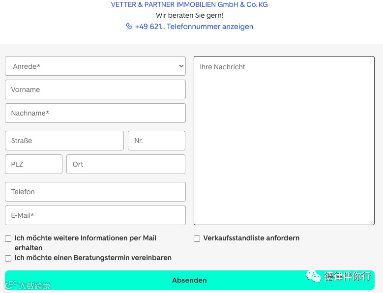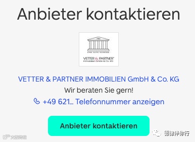 选中了心仪的房产后,需要与卖家取得联系或通过律师联系来预定房产。自行联系卖家的话房子信息页面都会有Anbieter Kontaktieren的部分,买家可以根据情况选择直接打电话联系,或填表联系。但是首次买房推荐填表联系,一般发送信息后的隔天都会收到回复。