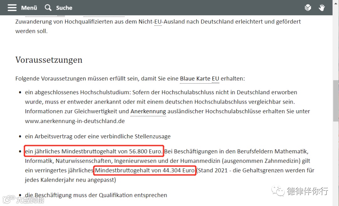 2021年起,蓝卡申请人的年薪应不少于56800欧元,从事短缺职业的蓝卡申请人年薪至少为44304欧元。