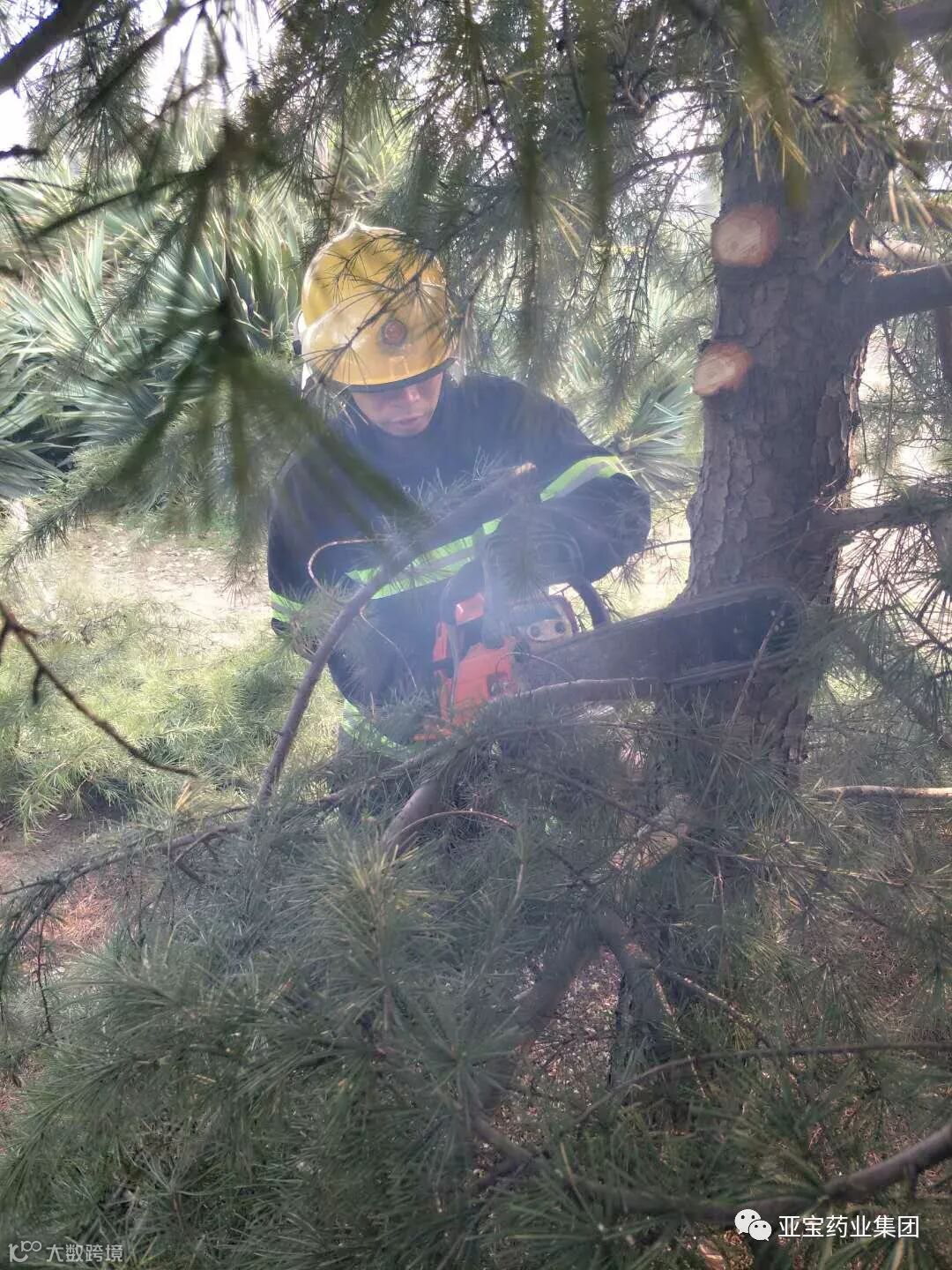 园区内树木通过十多年的生长,大部分已成长为茁壮的大树,树枝粗壮,修剪困难。在了解这一情况后,基于集团武装部配备有油电锯等森林灭火工具,工业园保卫部经理朱顺利主动请缨,接受了此次树木修剪的工作任务。