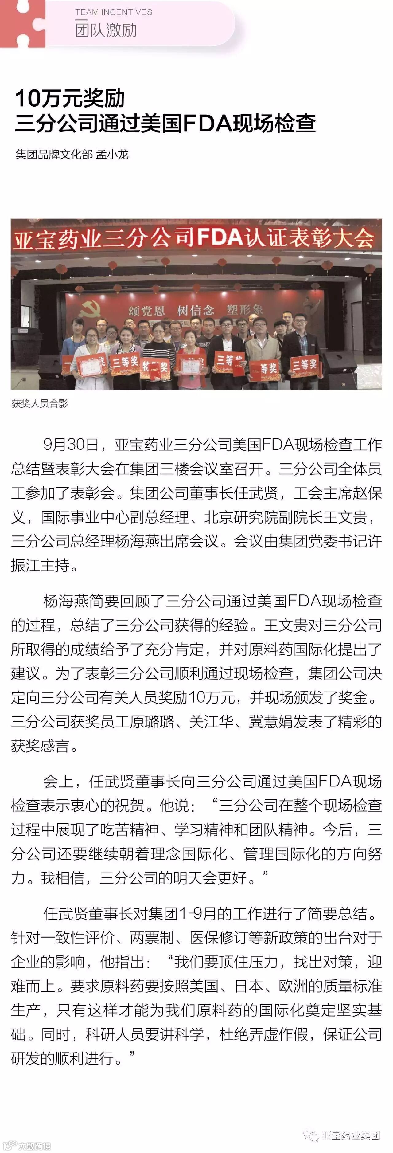 团队激励|10万元奖励三分公司通过美国FDA现场检查
