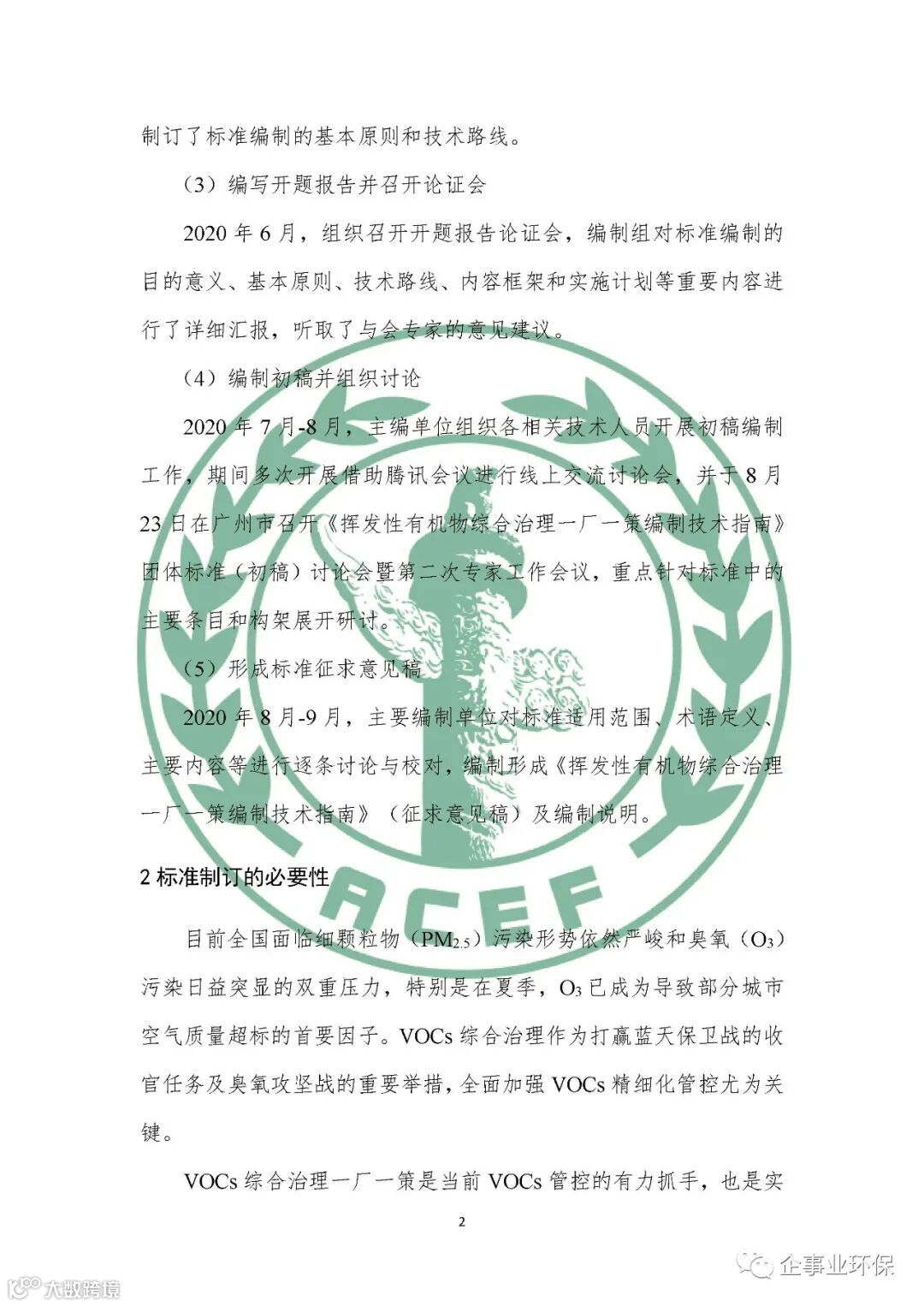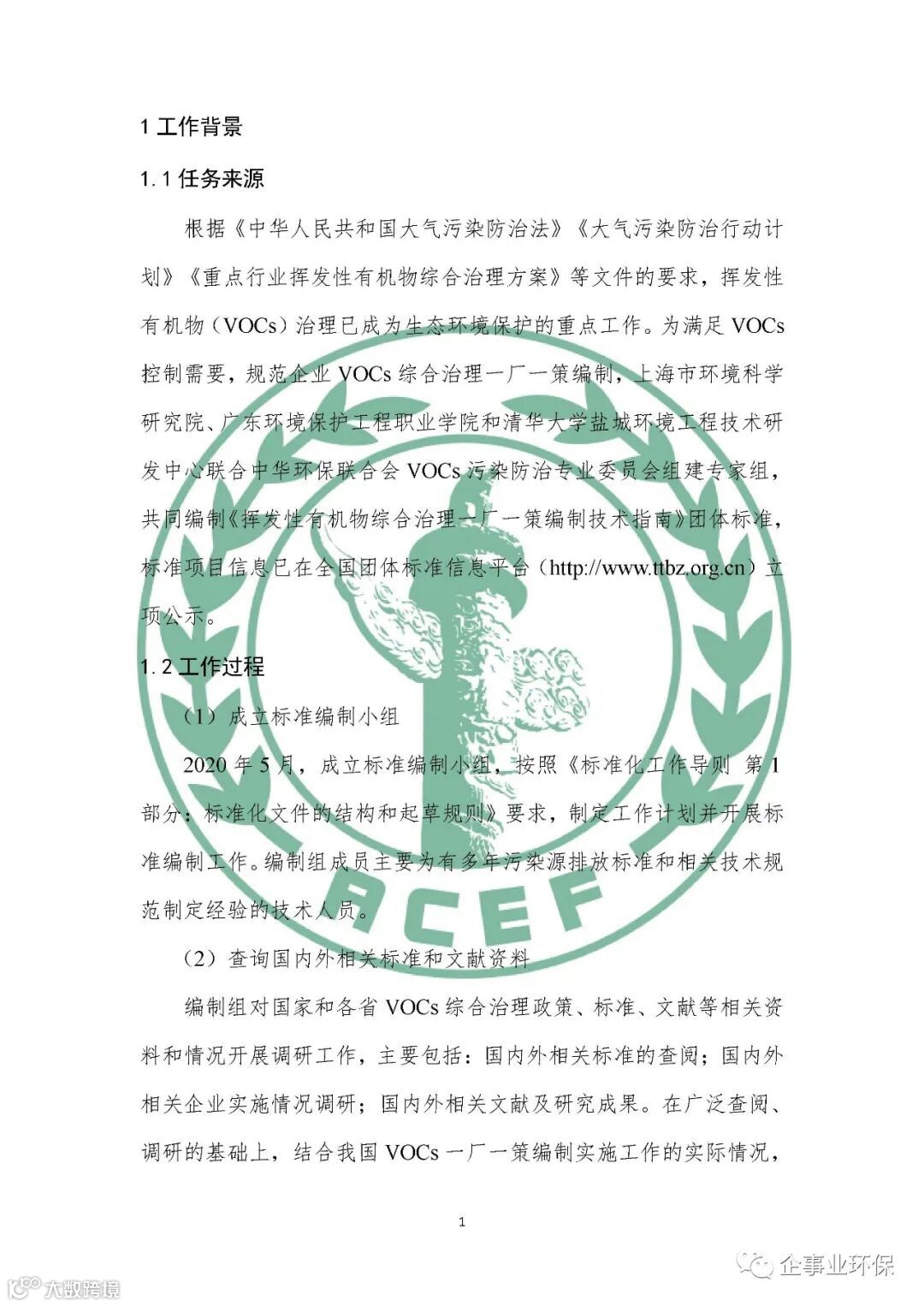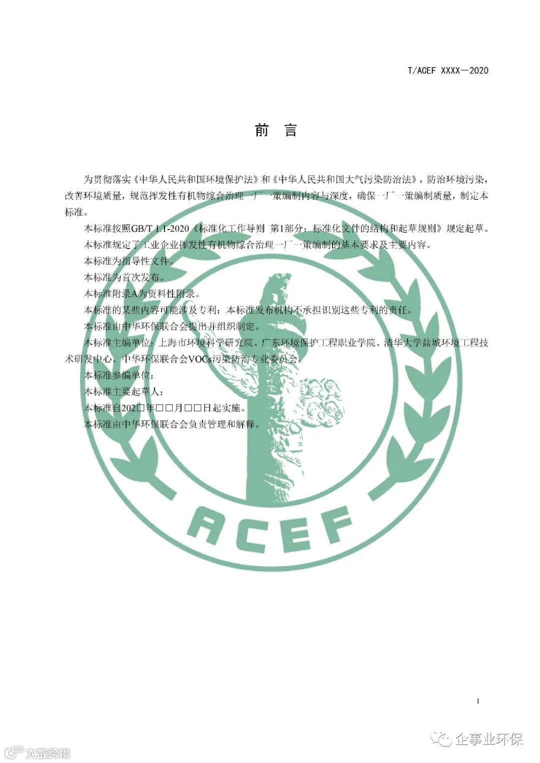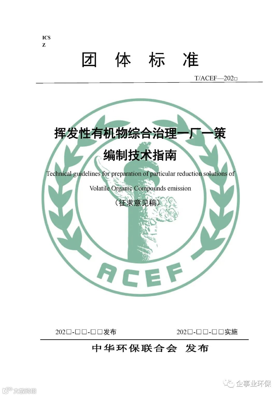 由中华环保联合会提出并归口管理,上海市环境科学研究院、广东环境保护工程职业学院、清华大学盐城环境工程技术研发中心、杭州楚环科技、清环智源(北京)、天津长瑞大通、中华环保联合会VOCs污染防治专业委员会等25家国内企事业单位共同编制的《挥发性有机物综合治理一厂一策编制技术指南》团体标准,历时6个月已经编制形成了征求意见稿。根据《团体标准管理规定》(国标委联〔2019〕1号)精神和《中华环保联合会团体标准管理办法(试行)》(中环联字〔2018〕79号)的相关规定,为保证标准的科学性、严谨性和适用性,现公开征求意见。