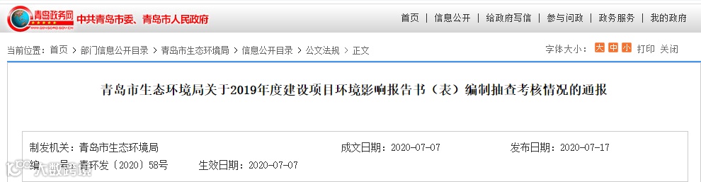 青岛市生态环境局关于2019年度建设项目环境影响报告书(表)编制抽查考核情况的通报