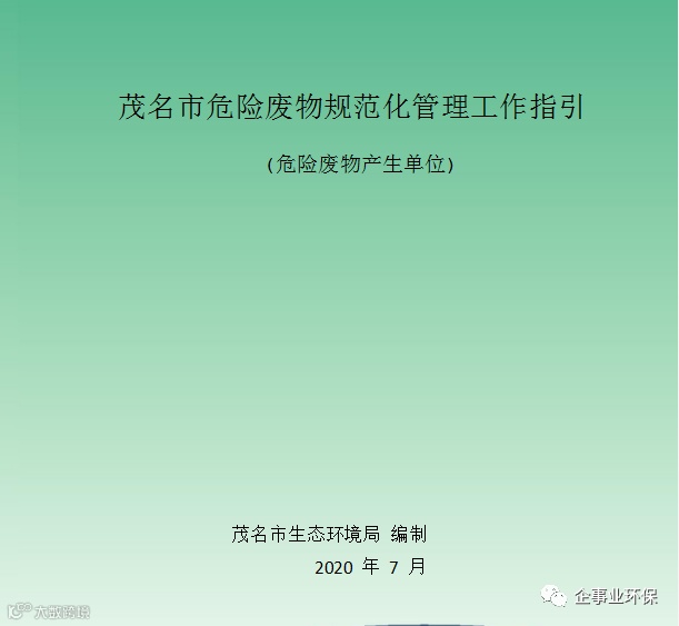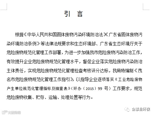 为督促指导企业逐项落实《工业危险废物产生单位规范化管理指标及抽查表》(环办〔2015〕99号)工作要求,规范危险废物收集、贮存、运输、处理处置等行为,现将《茂名市危险废物规范化管理工作指引》印发给你们,请认真抓好贯彻落实。