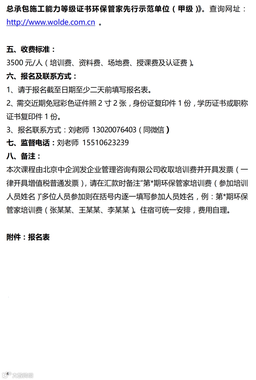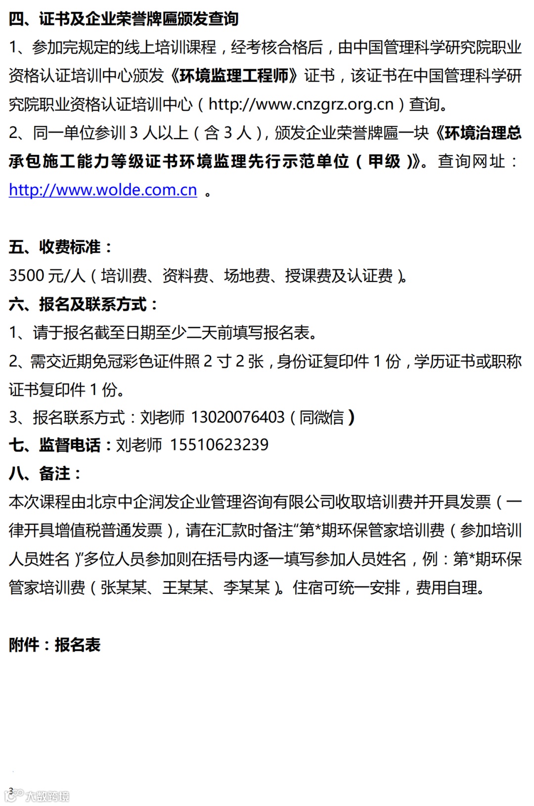 2、同一单位参训3人以上(含3人),颁发企业荣誉牌匾一块《环境治理总承包施工能力等级证书环保管家先行示范单位(甲级)》。查询网址:http://www.wolde.com.cn 。