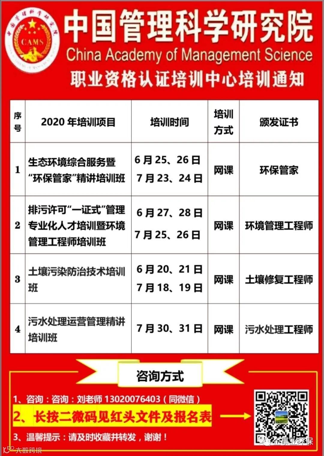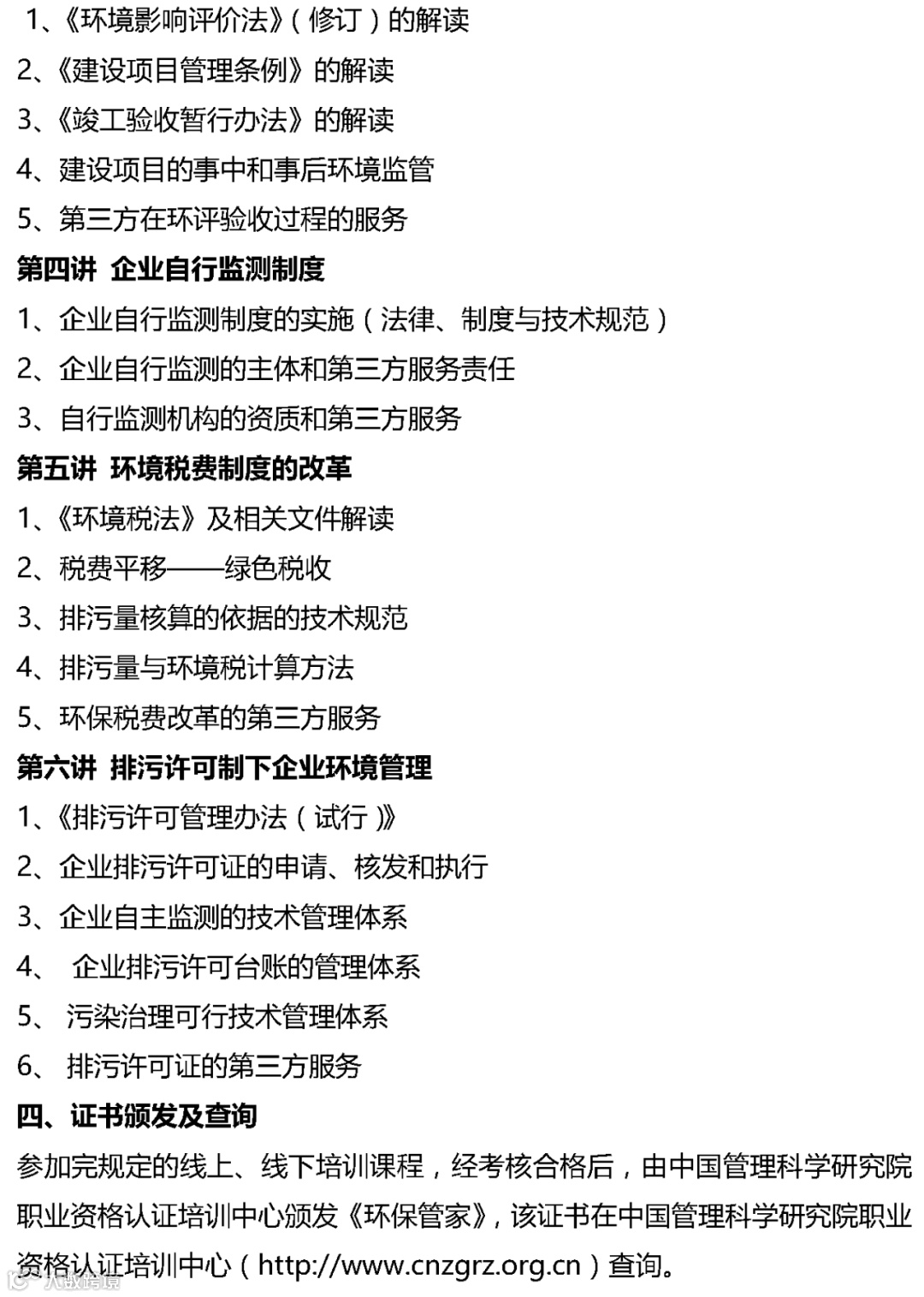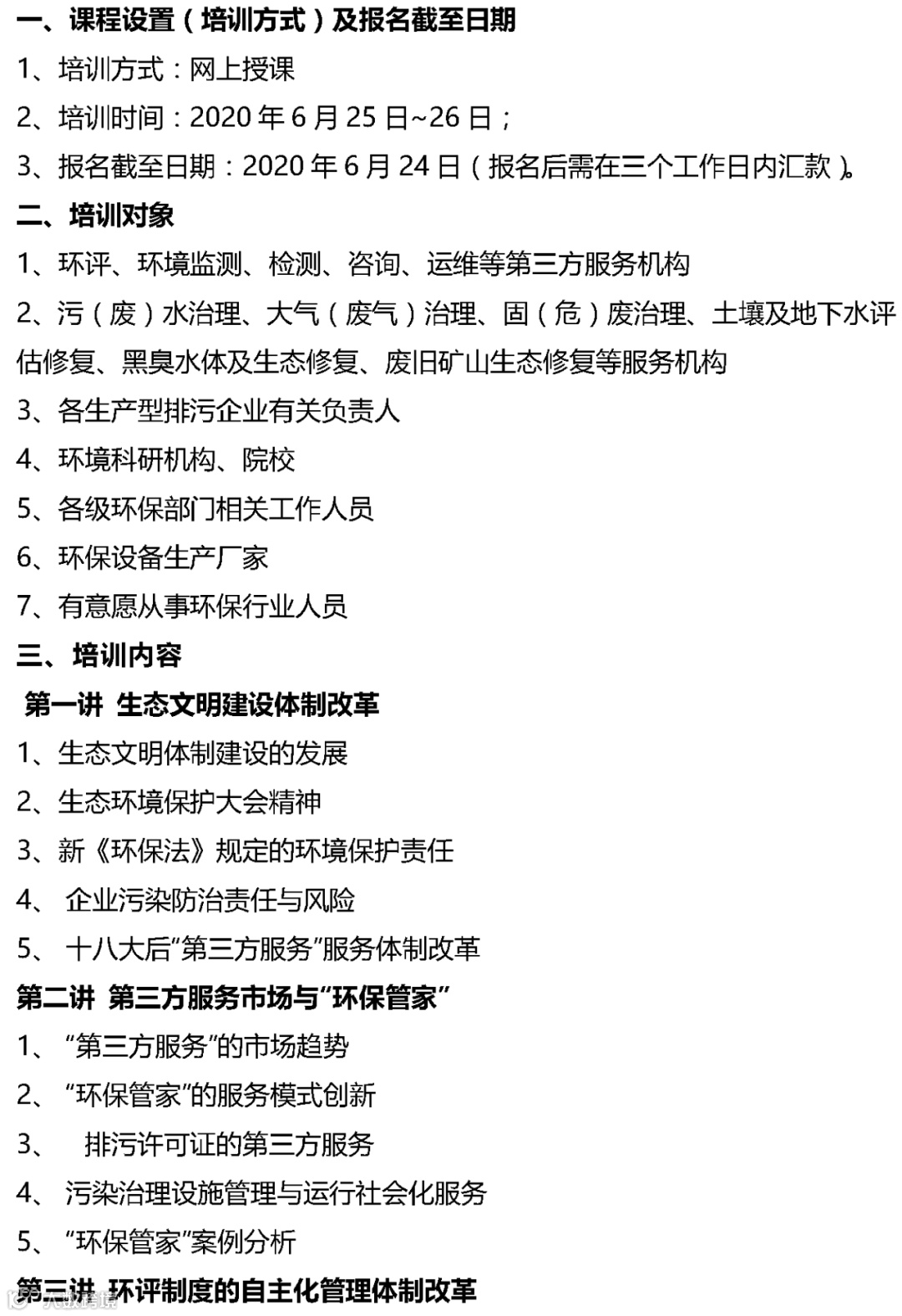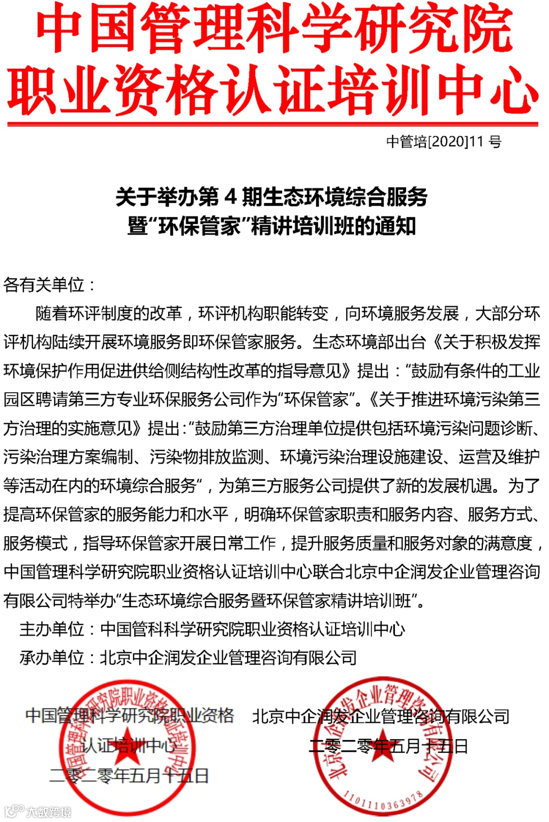 随着环评制度的改革,环评机构职能转变,向环境服务发展,大部分环评机构陆续开展环境服务即环保管家服务。生态环境部出台《关于积极发挥环境保护作用促进供给侧结构性改革的指导意见》提出:“鼓励有条件的工业园区聘请第三方专业环保服务公司作为“环保管家”。《关于推进环境污染第三方治理的实施意见》提出:“鼓励第三方治理单位提供包括环境污染问题诊断、污染治理方案编制、污染物排放监测、环境污染治理设施建设、运营及维护等活动在内的环境综合服务“,为第三方服务公司提供了新的发展机遇。为了提高环保管家的服务能力和水平,明确环保管家职责和服务内容、服务方式、服务模式,指导环保管家开展日常工作,提升服务质量和服务对象的满意度,中国管理科学研究院职业资格认证培训中心联合北京中企润发企业管理咨询有限公司特举办“生态环境综合服务暨环保管家精讲培训班”。
