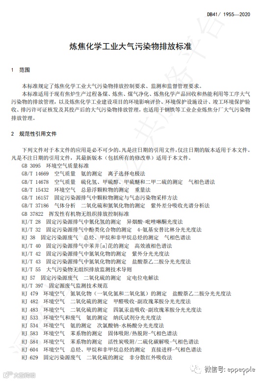 炼焦化学工业大气污染物排放标准(DB41 1955-2020 )