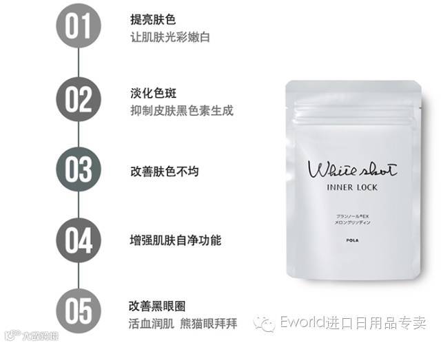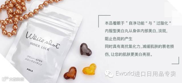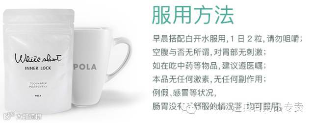 纯植物提取,最安全健康有效的美白丸。POLA官方宣传是孕妇也可以吃的美白丸。POLA的whiteshot是世界上唯一一个得到IFSCC认可的美白护肤品。其中的美白成分是POLA花了十年