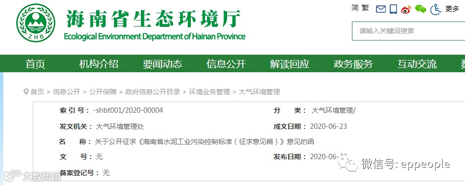 关于公开征求《海南省水泥工业污染控制标准(征求意见稿)》意见的函