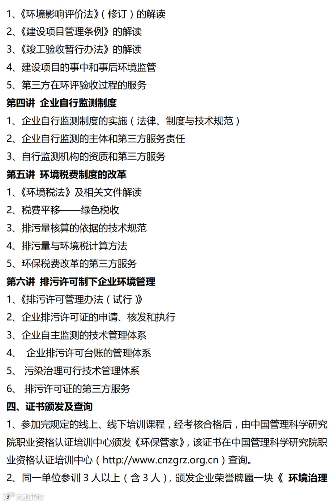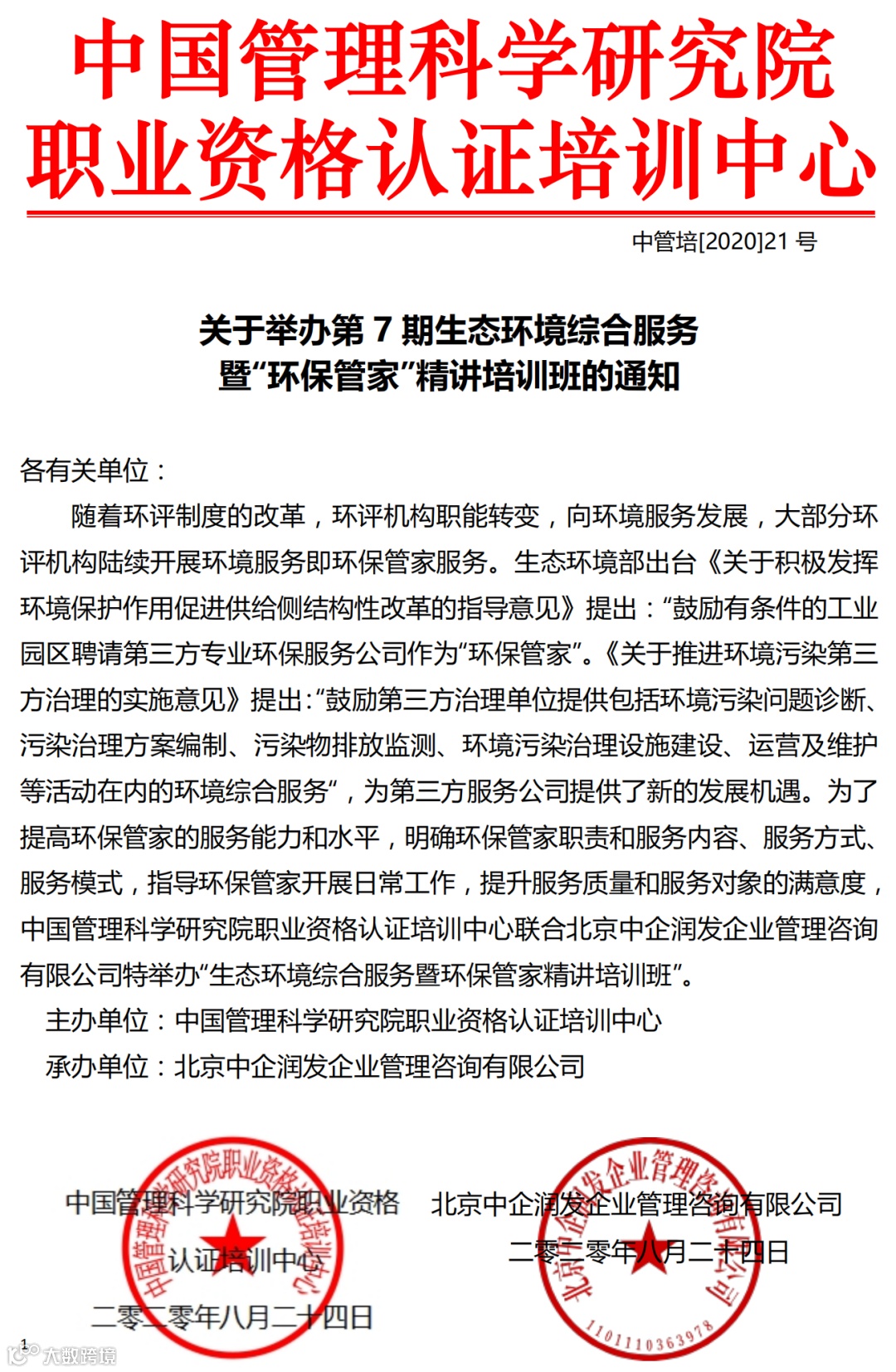 1、参加完规定的线上培训课程,经考核合格后,由中国管理科学研究院职业资格认证培训中心颁发《环保管家》证书,该证书在中国管理科学研究院职业资格认证培训中心(http://www.cnzgrz.org.cn)查询。