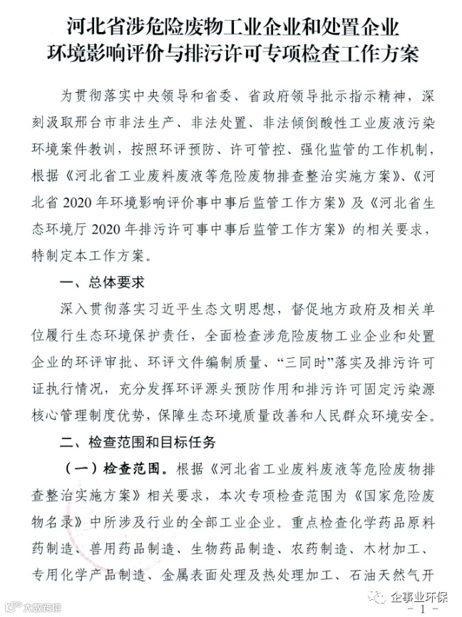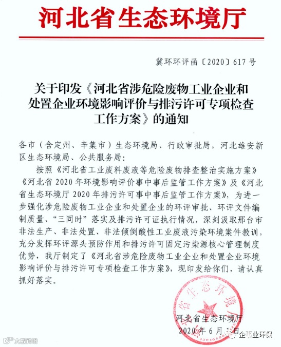 河北省发文开展涉危废工业企业和处置企业环评与排污许可专项检查